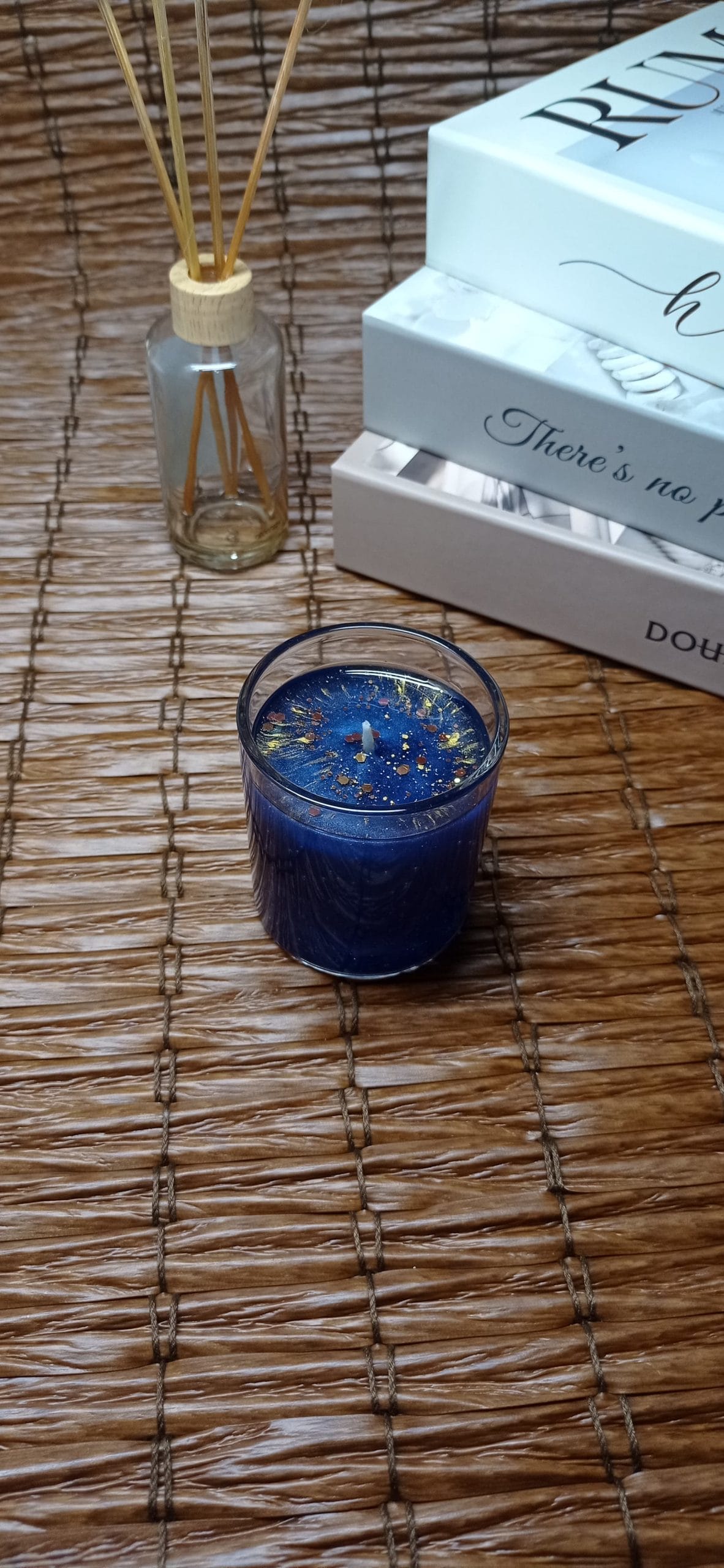 Derin lacivert rengiyle gecenin dinginliğini yansıtan bu mum üzerindeki sim taneleri ile ise sanki yıldız yağmuruna tutulmuş gibi… Her baktığında başka bir evrenin kapısını aralayacaksın.